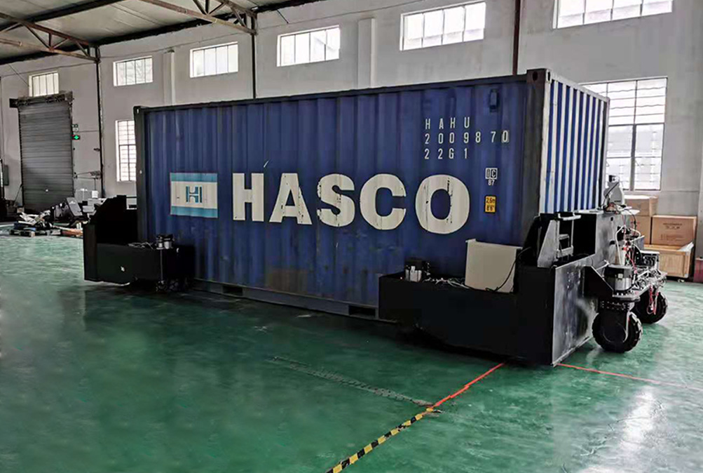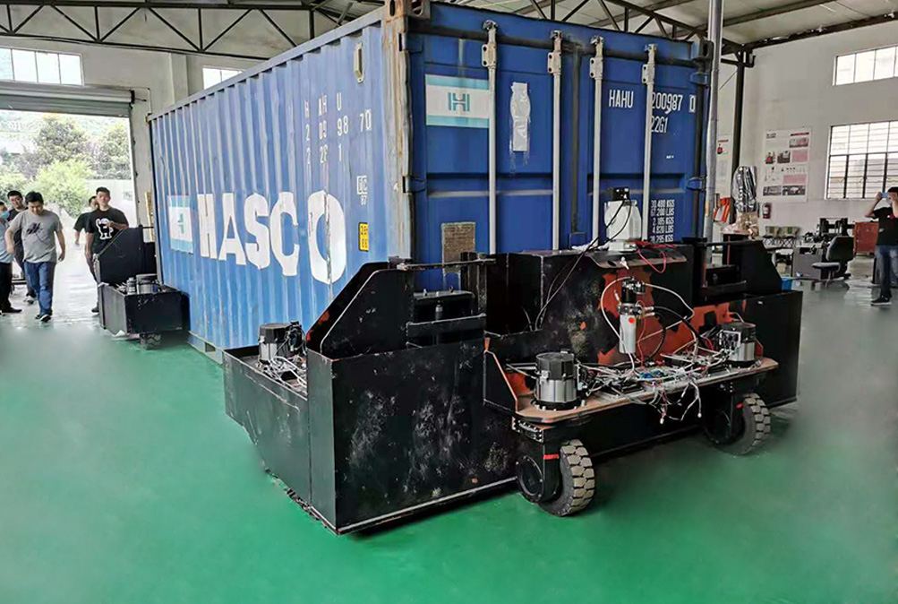 采用 2 台集装箱搬运机器人联合工作形式,采用组合式全方位 万向的四轮电驱动四轮电转向的运动方式,动力供应由蓄电池组提供能量。 本项目产品为一套集装箱搬运设备