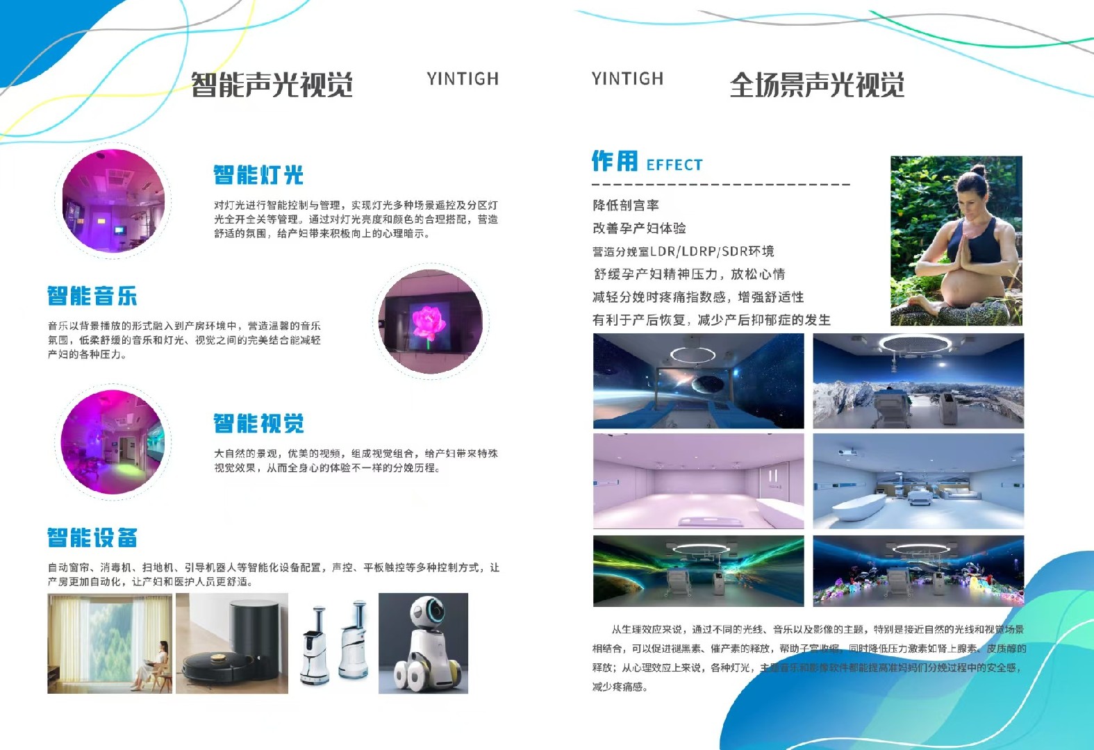 1. 多感官环境营造:在产妇视野内的三面墙呈现动态自然场景(如森林、海洋),配合环绕自然声效,转移注意力,降低疼痛感知。